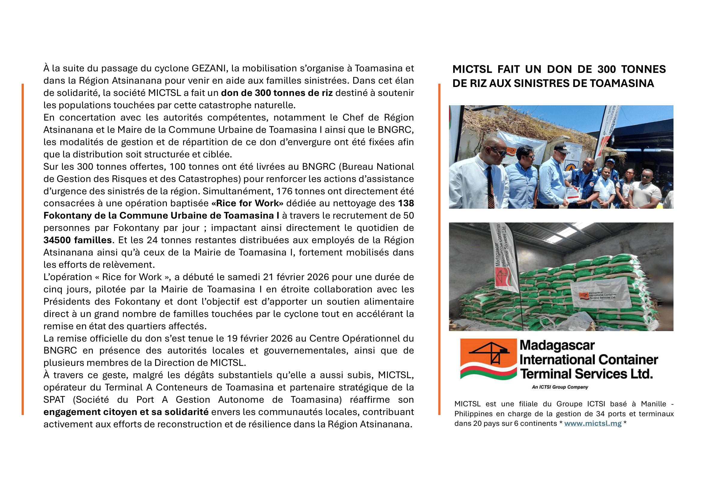 MICTSL FAIT UN DON DE 300 TONNES DE RIZ AUX SINISTRES DE TOAMASINA